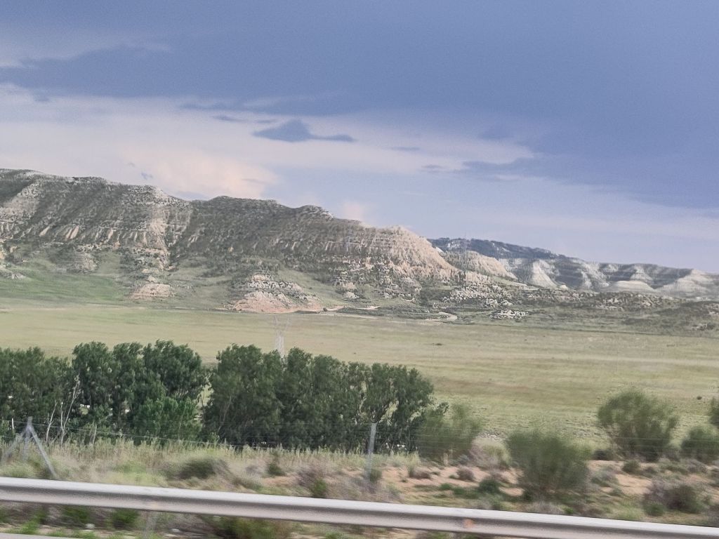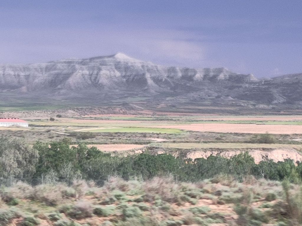 Der Zug von Zaragossa nach Teruel hat sich als Bus entpuppt. Im Hintergrund Mondlandschaft.